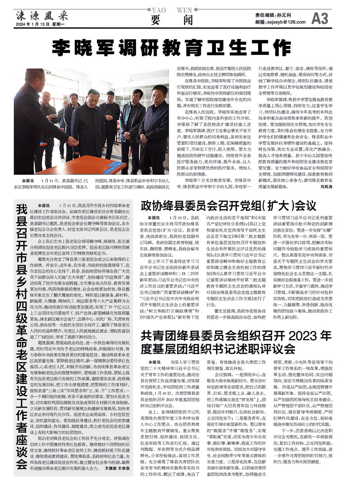 本报讯 1月11日,我县召开市县乡村四级革命老区建设工作者座谈会。运城市老区建设促进会常务副会长原启宏出席会议并讲话,市老促会副会长兼秘书长张启忠、县委副书记葛凯、县老促会原会长魏守峰等参加会议,各乡镇老促会分会负责人、村党支部书记列席会议。县老促会会长樊彦龙主持会议。