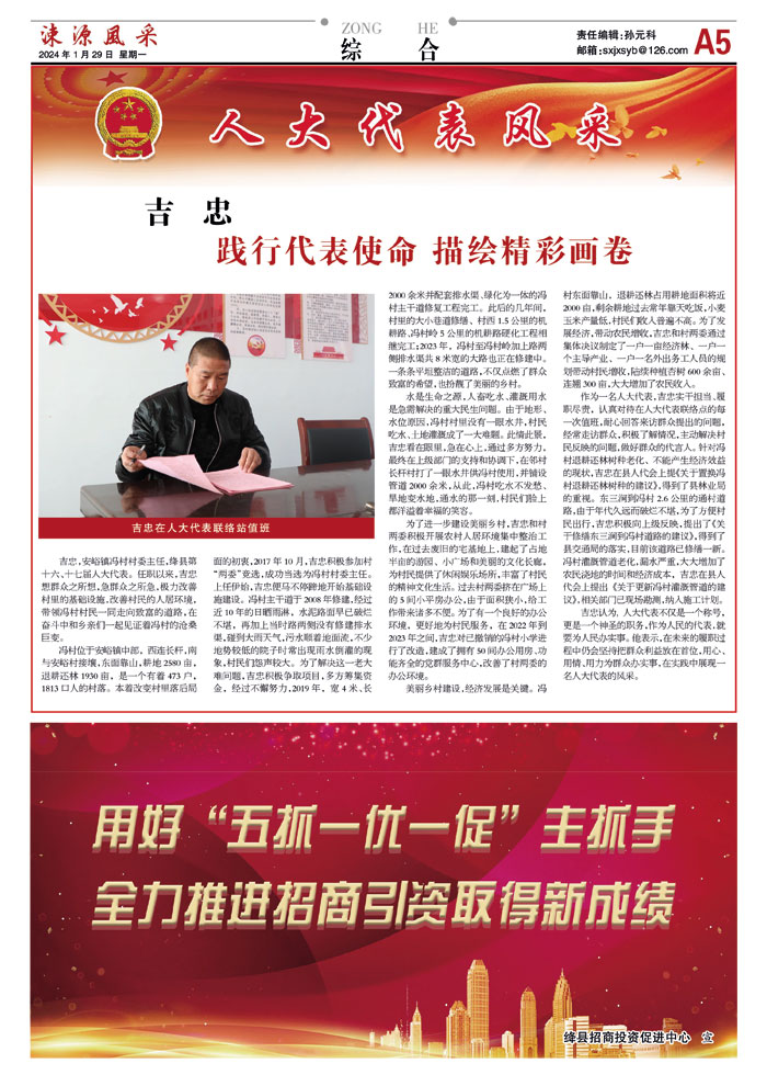 作为一名人大代表,吉忠实干担当、履职尽责,认真对待在人大代表联络点的每一次值班,耐心回答来访群众提出的问题,经常走访群众,积极了解情况,主动解决村民反映的问题,做好群众的代言人。针对冯村退耕还林树种老化、不能产生经济效益的现状,吉忠在县人代会上提《关于置换冯村退耕还林树种的建议》,得到了县林业局的重视。东三涧到冯村2.6公里的通村道路,由于年代久远而破烂不堪,为了方便村民出行,吉忠积极向上级反映,提出了《关于修缮东三涧到冯村道路的建议》,得到了县交通局的落实,目前该道路已修缮一新。冯村灌溉管道老化,漏水严重,大大增加了农民浇地的时间和经济成本,吉忠在县人代会上提出《关于更新冯村灌溉管道的建议》,相关部门已现场勘测,纳入施工计划。