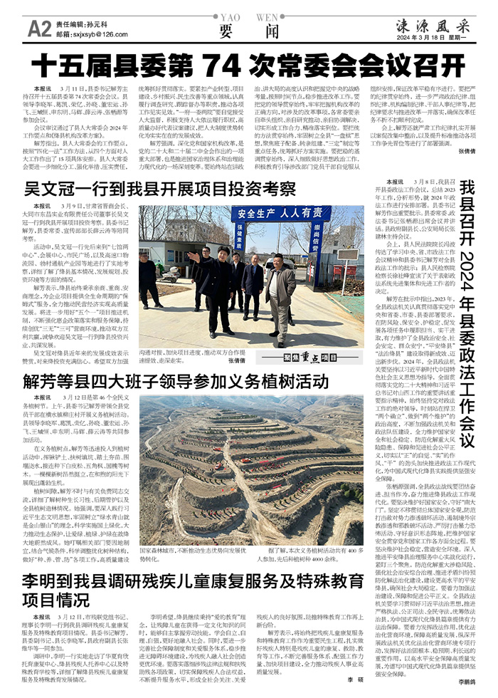 本报讯 3月9日,甘肃省晋商会长、大同市东昌实业有限责任公司董事长吴文冠一行到我县开展项目投资考察。县委书记解芳,县委常委、宣传部部长薛云涛等陪同考察。