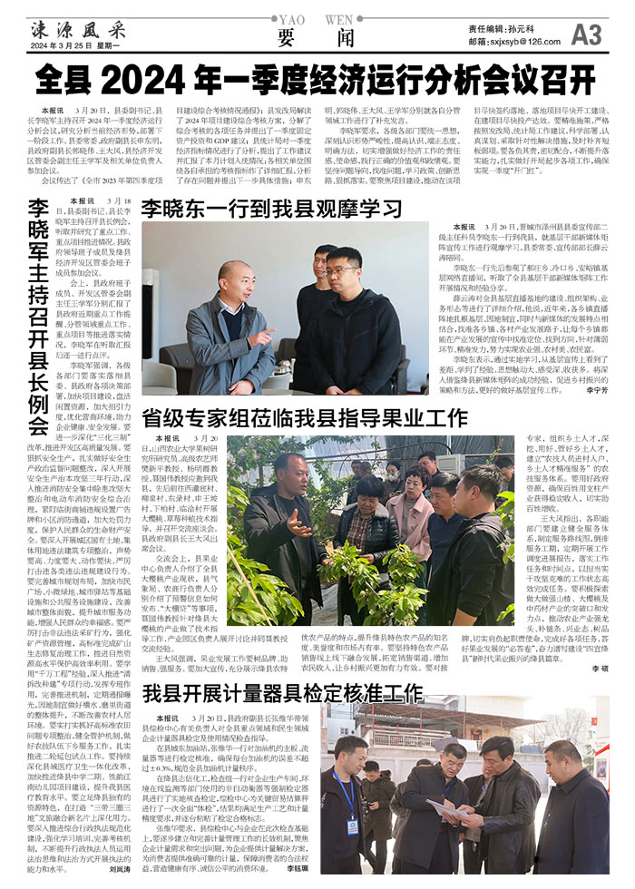 李晓军强调,各级各部门要落实落细县委、县政府各项决策部署,加快项目建设,盘活闲置资源,加大招引力度,优化营商环境,助力企业健康、安全发展。要进一步深化“三化三制”改革,推进开发区高质量发展。要狠抓安全生产,扎实做好安全生产政治监督问题整改,深入开展安全生产治本攻坚三年行动,深入推进消防安全集中除患攻坚大整治和电动车消防安全综合治理,紧盯临街商铺违规设置广告牌和小区消防通道,加大处罚力度,保护人民群众的生命财产安全。要深入开展城区国有土地、集体用地违法建筑专项整治,声势要高、力度要大、动作要快,严厉打击违各类违法违规建设行为。要完善城市规划布局,加快市民广场、小微绿地、城市驿站等基础设施和公共服务设施建设,改善城市整体面貌,提升城市服务功能,增强人民群众的幸福感。要严厉打击非法违法采矿行为,强化矿产资源管理,高标准完成矿山生态修复治理工作,推进自然资源高水平保护高效率利用。要学用“千万工程”经验,深入推进“清拆改种建”专项行动,发挥专班作用,完善推进机制,定期通报曝光,因地制宜做好横水、磨里街道的整体提升,不断改善农村人居环境。要实打实抓好高标准农田问题专项整治,健全管护机制,做好农技队伍下乡服务工作,扎实推进二轮延包试点工作。要持续深化县域医疗卫生一体化改革,加快推进绛县中学二期、铁韵江南幼儿园项目建设,提升我县医疗教育水平。要立足绛县独有的资源特色,在打造“三带三圈三地”文旅融合新名片上深化用力。要深入推进综合行政执法规范化建设,强化学习培训、完善考核机制,不断提升行政执法人员运用法治思维和法治方式开展执法的能力和水平。