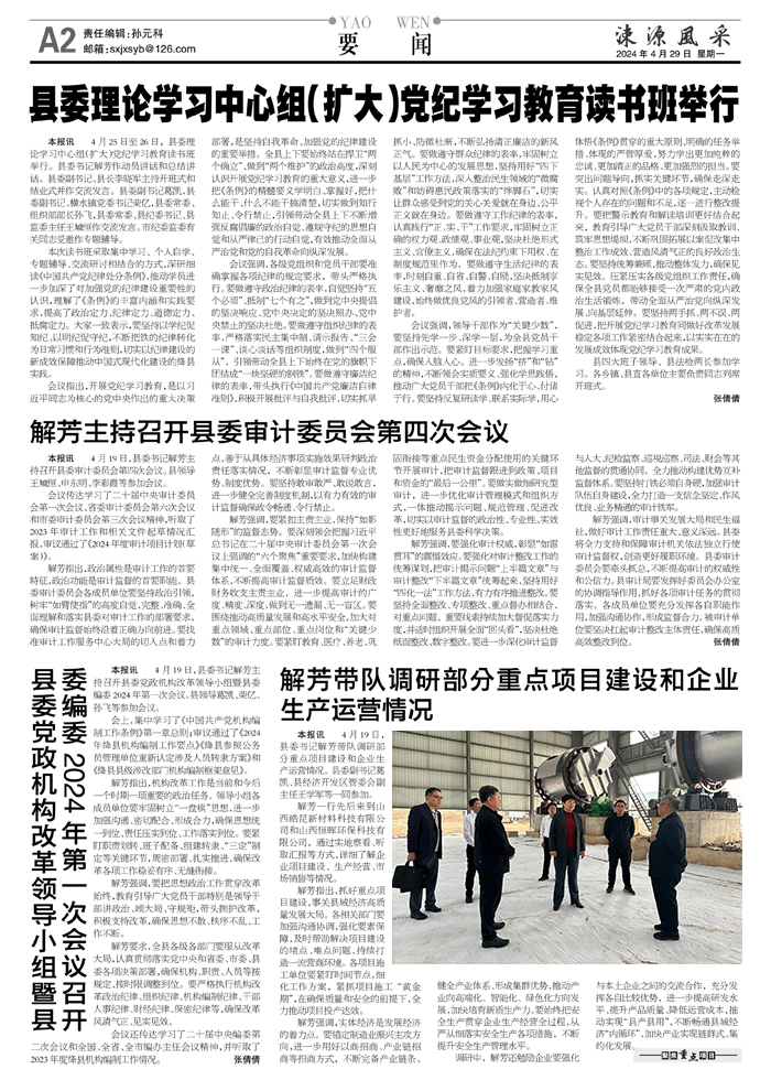 本报讯 4月25日至26日,县委理论学习中心组(扩大)党纪学习教育读书班举行。县委书记解芳作动员讲话和总结讲话。县委副书记、县长李晓军主持开班式和结业式并作交流发言。县委副书记葛凯,县委副书记、横水镇党委书记荣亿,县委常委、组织部部长孙飞,县委常委、县纪委书记、县监委主任王虓恒作交流发言。市纪委监委有关同志受邀作专题辅导。