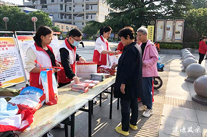 活动现场以悬挂横幅、摆放展板、发放宣传手册、宣传折页,向广大居民普及《中华人民共和国红十字会法》、无偿献血、造血干细胞捐献、人体器官捐献、应急救护等红十字知识,发放各种宣传资料500余份。