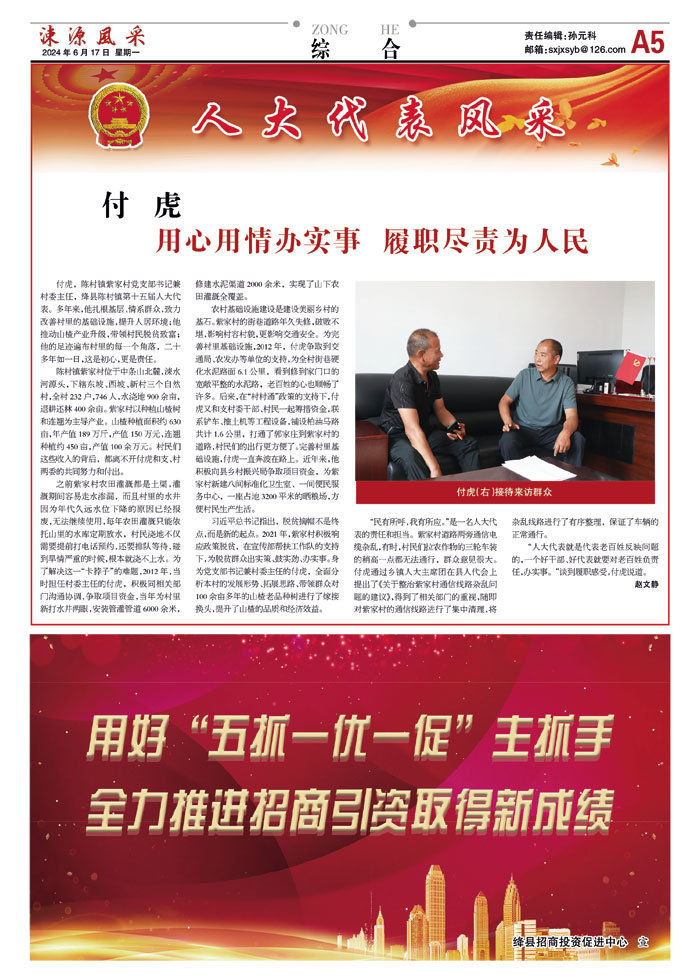 付虎,陈村镇紫家村党支部书记兼村委主任,绛县陈村镇第十五届人大代表。多年来,他扎根基层、情系群众,致力改善村里的基础设施,提升人居环境;他推动山楂产业升级,带领村民脱贫致富;他的足迹遍布村里的每一个角落,二十多年如一日,这是初心,更是责任。
