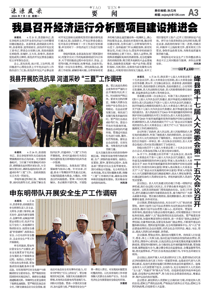 本报讯 6月26日,县委副书记、县长李晓军带队先后前往南樊镇槐泉村水泛沟水库、大交镇续鲁峪河,卫庄镇下村里册峪河采砂段、南樊镇东赵村黑河采砂段,大交镇东贺水村,调研各地防汛抗旱、河道采砂和“三夏”工作。县政府副县长王大风一同前往。