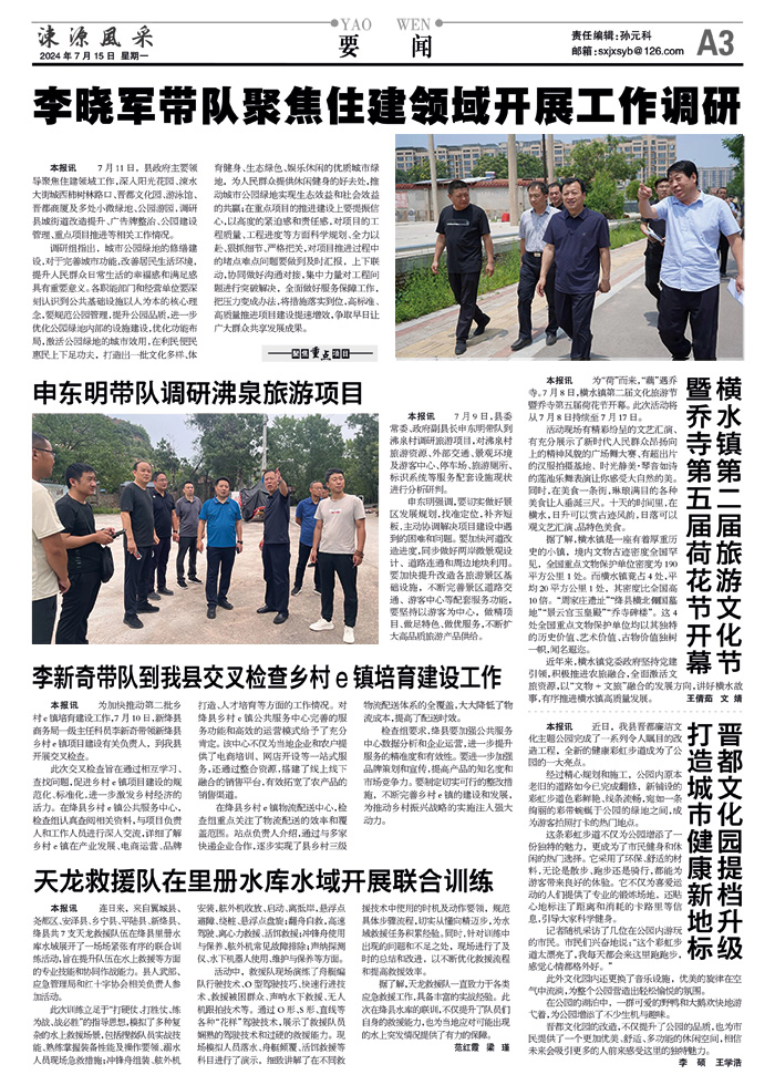 本报讯 7月9日,县委常委、政府副县长申东明带队到沸泉村调研旅游项目,对沸泉村旅游资源、外部交通、景观环境及游客中心、停车场、旅游厕所、标识系统等服务配套设施现状进行分析研判。