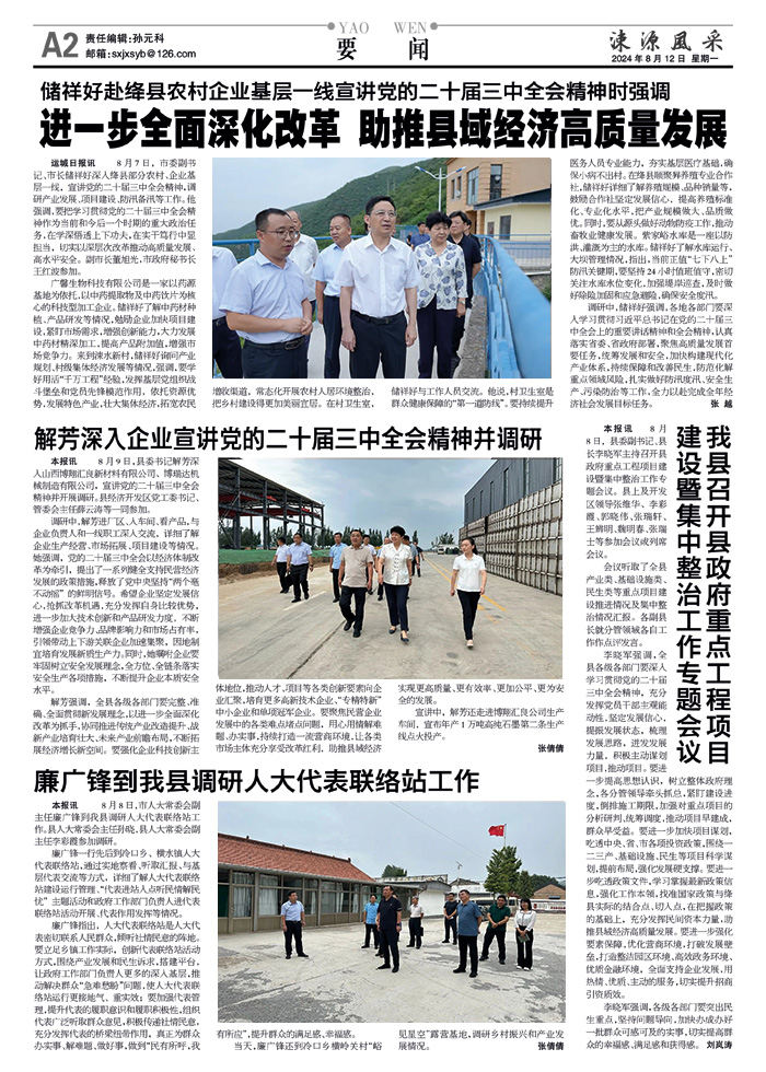 本报讯 8月9日,县委书记解芳深入山西博翔汇良新材料有限公司、博瑞达机械制造有限公司,宣讲党的二十届三中全会精神并开展调研。县经济开发区党工委书记、管委会主任薛云涛等一同参加。