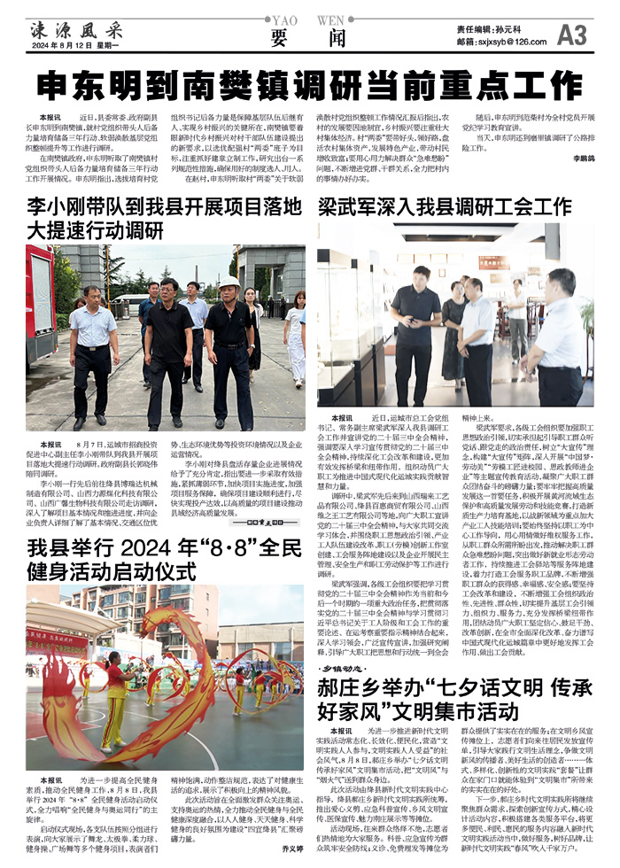 在赵村,申东明听取村“两委”关于软弱涣散村党组织整顿工作情况汇报后指出,农村的发展要因地制宜,乡村振兴要注重壮大村集体经济。村“两委”要带好头,领好路,盘活农村集体资产,发展特色产业,带动村民增收致富;要用心用力解决群众“急难愁盼”问题,不断增进党群、干群关系,全力把村内的事情办好办实。