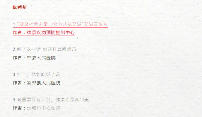 为推进健康中国·山西行动,进一步调动医务人员参与科普宣传的积极性,普及健康知识,不断满足人民群众日益增长的健康知识需求,提高全民健康素养,省卫生健康委组织举办了2024年山西省健康科普作品大赛。根据评审规则,经专家评审,运城市共有47部作品获奖,绛县疾病预防控制中心(县卫生监督所)选送的2部视频类作品荣获优秀奖。