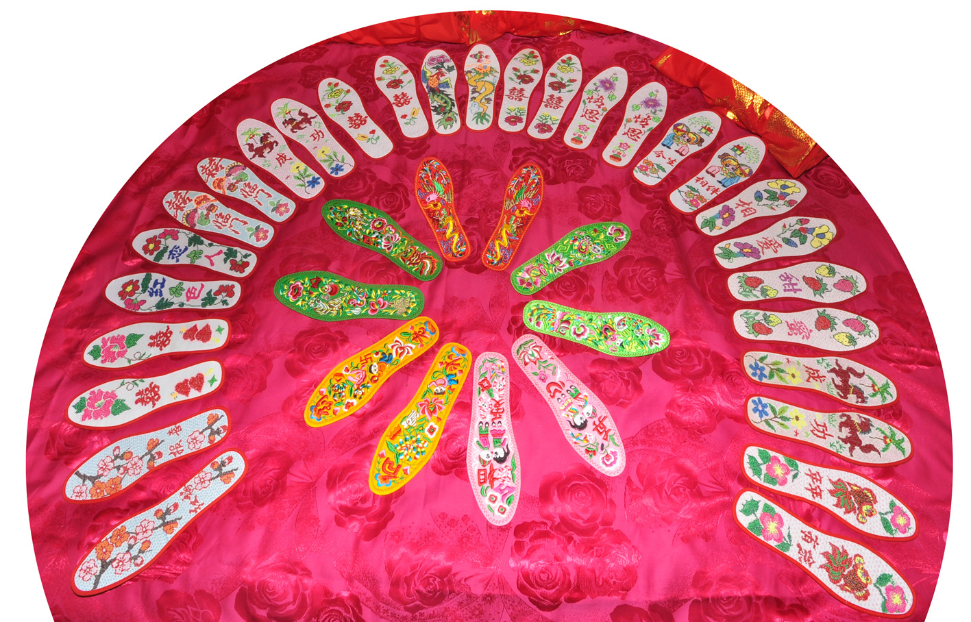 绛县刺绣是先前家庭妇女们必须做的“针线活儿”,它与布扎有相似之处,但又不尽相同。常见的有信札、枕套、围裙、绣花鞋、绣荷包、衣服花边、鞋垫等,内容多为吉祥的词语配以鲜花图案。绛县刺绣缩千里于尺幅,绣万趣于指下,山水能分远近之趣,楼阁能得深邃之体,人物能具瞻眺之情,花鸟能具绰约亲昵之态,图案精美,赞誉不断。毛家坡村王春莲创作出近百幅生活气息浓厚、异彩纷呈的鞋垫图,既有妩媚动人的各种花儿,又有千姿百态的十二生肖,还有象征着吉祥如意的 “龙凤配”等,每图皆新,从不重复。苦绘数月,终于完成。在2008年北京奥运会前寄达北京,表达自己的祝贺之情。《山西日报》等报纸作了报道。随着时代发展,绛县民间刺绣正走出山乡,走进都市,成为城里人争相购买的装饰品。