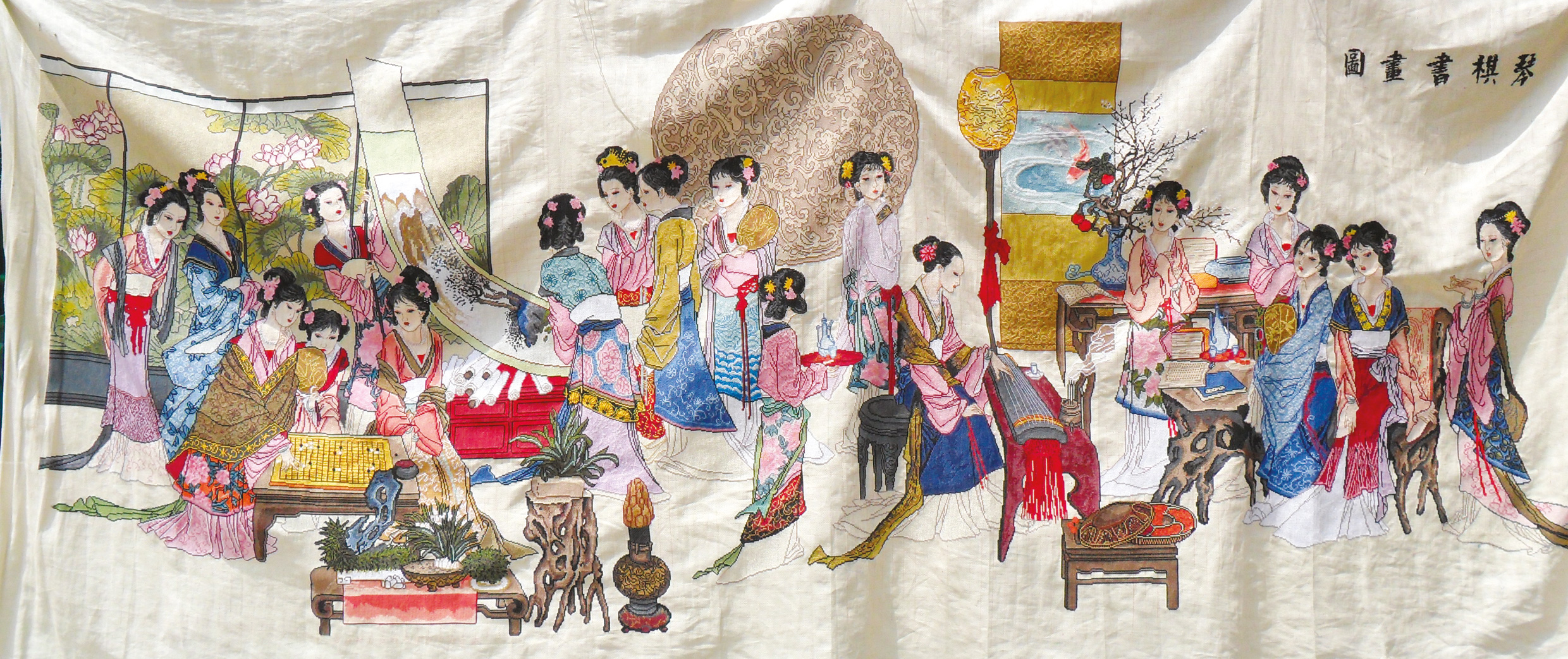 十字绣是新世纪传入绛县的一种民间工艺。这是女子在藏青色的棉布上,按照自己喜欢的纹样样板,以白色棉线为纹线骨架,配以多彩丝线的十字交叉针法挑制成的一种刺绣。其中针脚为“×”字形的称“十字绣”,针脚为“一”字形的称平线绣。它包括团花、边花、角花、填心花等;表现手法简练、高度夸张变形、高度程式化、几何化;描绘的对象有龙凤、花鸟、人兽、虫鱼、器具及少量的文字;反映的内容有吉祥富贵的婚嫁、娱乐、戏曲故事等等;挑法上有单面挑与双面挑,用特技针法挑出正反两面一样的图案;品种有数十种,大至被面、门帘,小至香袋、袜带,均为妇女、儿童日常生活穿戴和卧房内的部分用品,大量的是用于客厅壁画装饰。2010年,绛县古绛镇城内村农妇汪翠萍,独自完成一幅大型的《琴棋书画》十字绣,作品长3.6米,宽1.43米,耗时9个月,用了102种不同颜色的绣线,总针数达到了36.1万多针。整幅绣品上绣制的琴、棋、书、画等文化娱乐物品写实逼真,各种人物穿插其间,动作表情丰富,神态各不相同,栩栩如生。多家媒体报道,引起轰动。