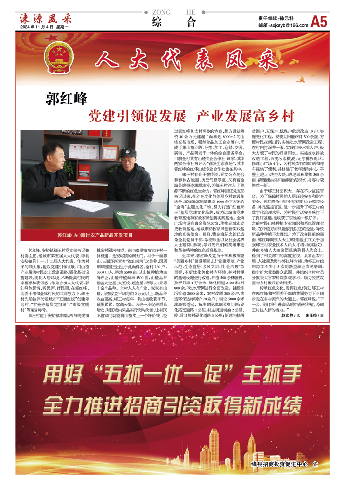 郭红峰,安峪镇郇王村党支部书记兼村委主任,运城市第五届人大代表,绛县安峪镇第十一、十二届人大代表。作为村子的领头雁,他以党建引领发展,用山楂产业带动村民走上致富道路,强化基础设施建设,美化人居环境,不断提高村民的幸福感和获得感 ,作为乡镇人大代表,郭红峰体民情,听民声,纾民困,在郭红峰、两委干部和全体村民的共同努力下,郇王村先后被评为运城市“五面红旗”创建示范村、“市先进基层党组织”,“市级文明村”等荣誉称号。