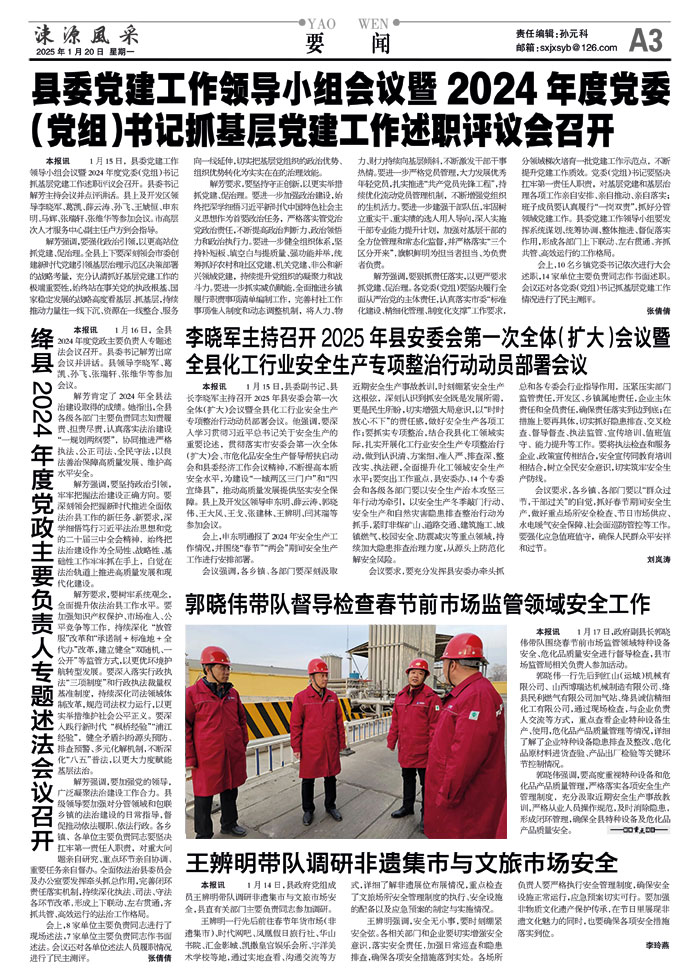 解芳要求,要树牢系统观念,全面提升依法治县工作水平。要加强知识产权保护、市场准入、公平竞争等工作,持续深化“放管服”改革和“承诺制+标准地+全代办”改革,建立健全“双随机、一公开”等监管方式,以更优环境护航转型发展。要深入落实行政执法“三项制度”和行政执法裁量权基准制度,持续深化司法领域体制改革,规范司法权力运行,以更实举措维护社会公平正义。要深入践行新时代“枫桥经验”“浦江经验”,健全矛盾纠纷源头预防、排查预警、多元化解机制,不断深化“八五”普法,以更大力度赋能基层法治。