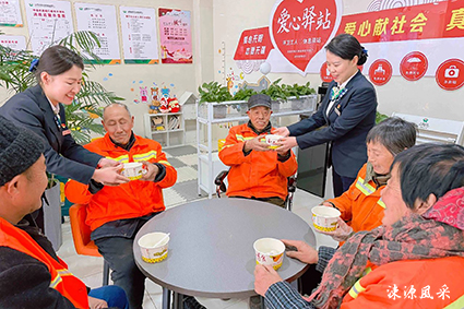 桥东分理处 桥东分理处开展了“情暖元宵、传递温情”的元宵节主题活动,为环卫工人们送上节日的关环与祝福,工作人员不仅准备好了香甜的汤圆,还安排了防诈金融知识讲解和现场提问答疑环节,大家围坐在一起,一边品尝着热气腾腾的汤圆,一边闲话家常,现场气氛温馨融洽。一位环卫工人李大爷开心地说:“平时工作忙,都没什么时间过节日,没想到在这儿能吃到这么暖心的汤圆,谢谢你们!”