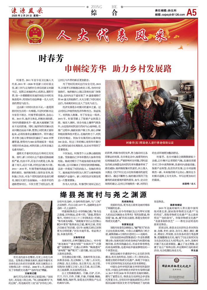 时春芳, 2011年至今任卫庄镇人大代表,2011年-2020年任新三村村委主任,新三村与义沟桥村合并后任新义村副书记。任职以来她始终心系群众,履职尽责,每一步都踏踏实实地印刻在乡村的发展进程中,用实际行动诠释着一名人大代表的责任与担当。
