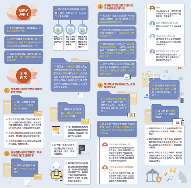 二是完善登记档案管理规范,细化电子登记档案管理要求。《办法》对登记档案的归档范围、立卷标准、存储要求、管理制度、保管期限等作出规定。明确经营主体存续期间,登记档案应当持续保存,经营主体注销后,登记档案保管期限一般为20年,登记机关应当定期对保管期限届满的登记档案的保存价值进行鉴定,决定予以销毁或者移交给同级国家综合档案馆永久保存。《办法》还对电子登记档案的归档、安全管理、系统建设等作出规定。