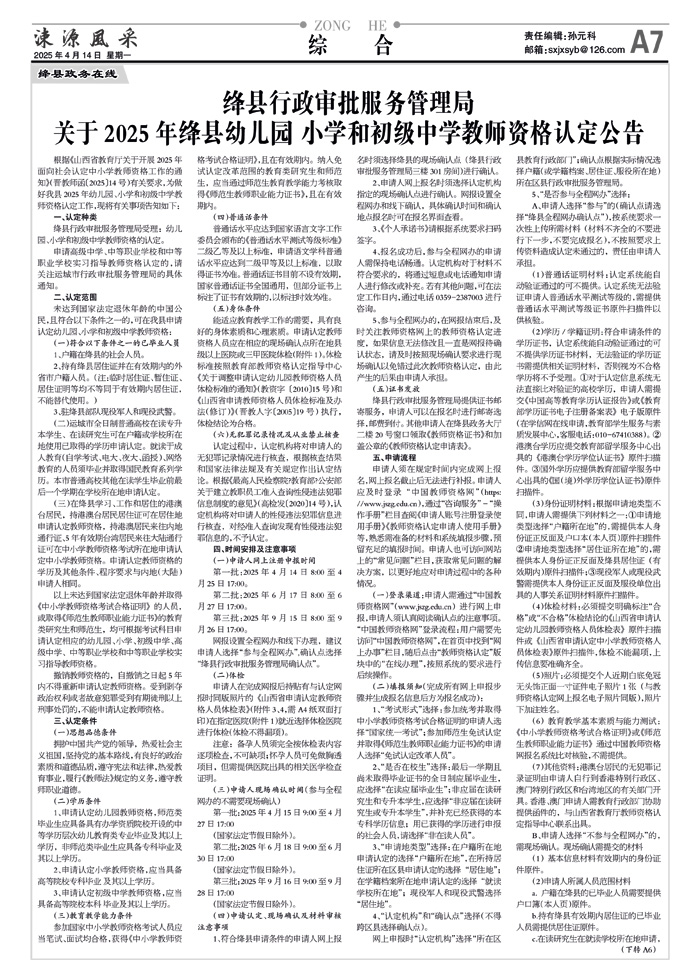 绛县行政审批服务管理局关于2025年绛县幼儿园 小学和初级中学教师资格认定公告