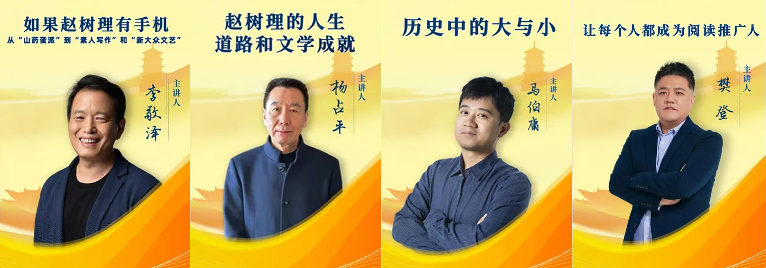 此次活动邀请到了李敬泽、杨占平、马伯庸、樊登四位重磅嘉宾,他们将围绕阅读、文化热点,分别带来“如果赵树理有手机——从‘山药蛋派’到‘素人写作’和‘新大众文艺’”“赵树理的人生道路与文学成就”“历史中的大与小”“让每个人都成为阅读推广人”四个主题展开讲座。