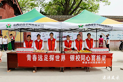 赓续五四薪火,激扬青春梦想。在五四青年节来临之际,绛县农商银行积极履行社会责任,彰显金融担当,在4月30日清晨,我行员工早早抵达太阴寺脚下,搭帐篷、搬物资、摆台架,搭建起醒目的“青春能量补给站”。一箱箱矿泉水排列成“护航”造型,独立包装的面包、糖果、火腿肠整齐码放——这些细节满满的准备,只为迎接绛县高中1000余名师生的远足队伍。