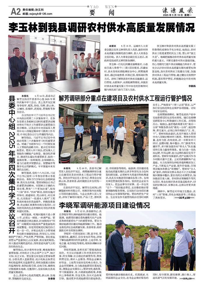 本报讯 5月15日,运城市人大常委会副主任李玉林带队深入我县,就农村供水高质量发展情况进行调研。县人大常委会主任孙晓,县人大常委会副主任王述江,县政府党组成员王辨明参加调研。