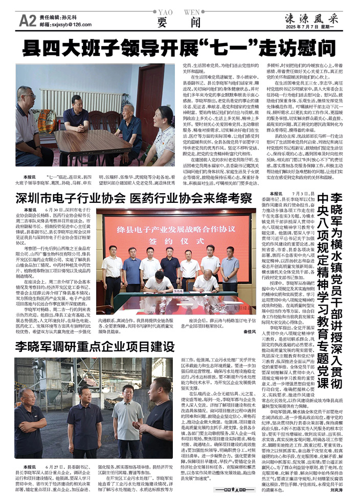 本报讯 6月30日,深圳市电子行业协会副会长杨路、医药行业协会秘书长周二吉率队来我县考察并召开座谈会。市政府副秘书长、招商投资促进中心主任黄锋斌,县委副书记、县长李晓军出席会议并见证我县与深圳市电子行业协会签订框架协议。