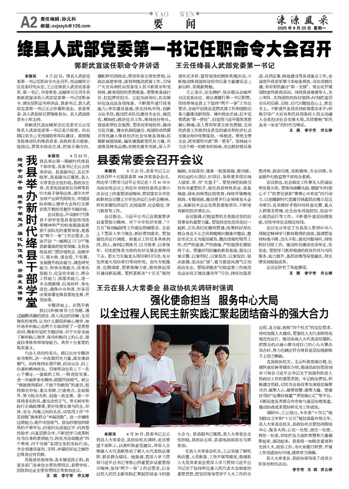 本报讯 8月22日,我县举办第一期新时代绛县干部学堂。县委书记王云主持并讲话。县委副书记、县长李晓军,县委副书记葛凯,县人大常委会主任孙晓,县政协主席、县委统战部部长马辉等县四大班子领导出席。清华大学全球产业研究院院长、中国国际积极心理学大会执行主席彭凯平教授受邀作专题讲座。