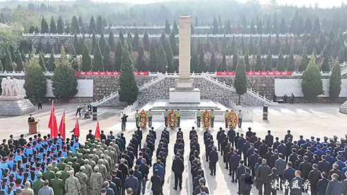 王云迈步走到花篮前,驻足凝视,郑重整理花篮缎带。全体人员瞻仰烈士纪念碑,聆听红色革命事迹,缅怀先烈不朽功勋。