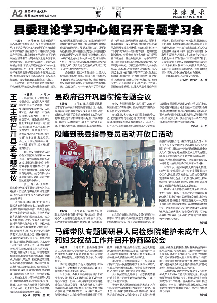 本报讯 10月20日,县委书记王云主持召开专题会议。会议深入学习贯彻习近平总书记考察山西重要讲话重要指示精神,认真落实党中央和省委、市委决策部署,坚持“两干一争”工作总要求,听取县经济开发区化工(医药)园区认定、重点项目推进等工作汇报,研究部署下一阶段重点工作,为全面推进“四个聚焦、四个突破”打牢基础、蓄足后劲。县上及开发区领导薛云涛、申东明、王学军、闫其瑞、曹谨等参加。