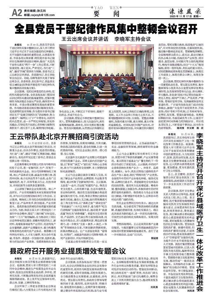 本报讯 11月11日,县委副书记、县长李晓军主持召开服务业提质增效专题会议。他强调,要深入学习贯彻党的二十届四中全会精神,推进生产性服务业向专业化延伸、促进生活性服务业高品质、多样化、便利化发展,不断推动绛县经济社会高质量发展取得新成效。县上及开发区领导申东明、薛云涛、吴睿、王辨明等参加。