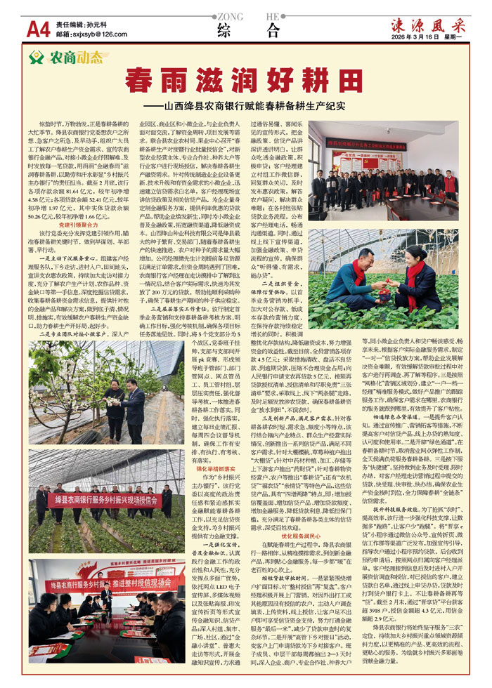 在赋能春耕生产过程中,绛县农商银行一路相伴,从精准摸排需求,到创新金融产品,再到贴心金融服务,每一步都“暖”在老百姓的心坎上。