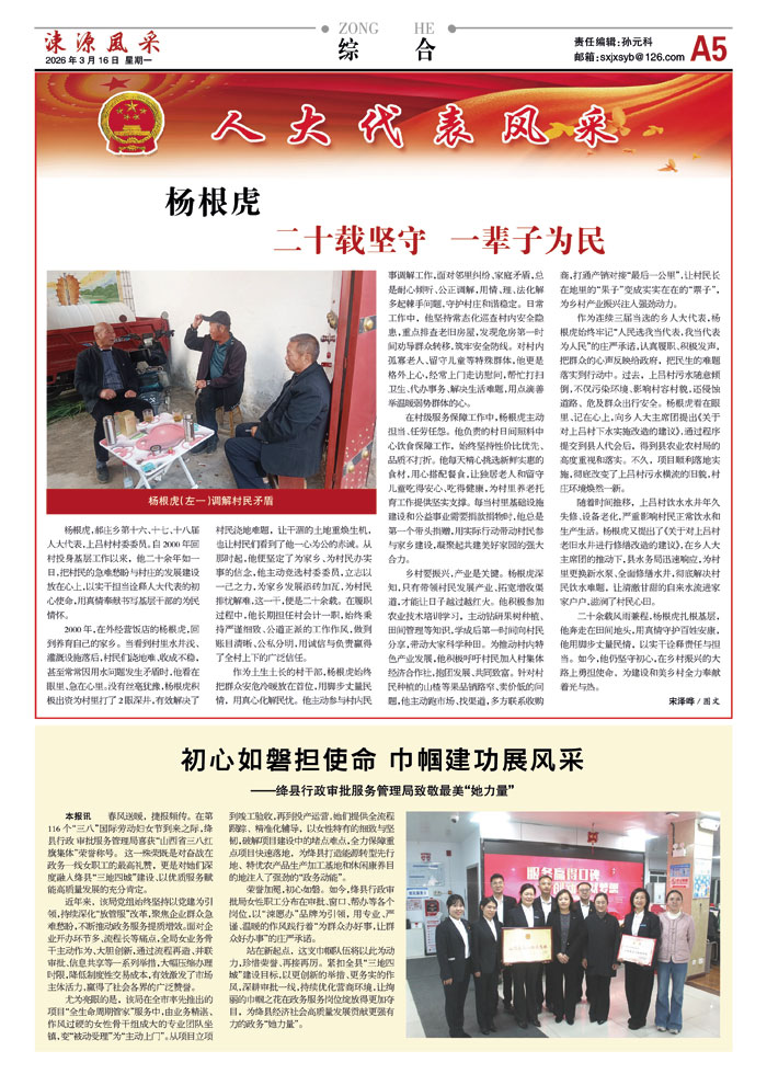 2000年,在外经营饭店的杨根虎,回到养育自己的家乡。当看到村里水井浅、灌溉设施落后,村民们浇地难、收成不稳,甚至常常因用水问题发生矛盾时,他看在眼里、急在心里。没有丝毫犹豫,杨根虎积极出资为村里打了2眼深井,有效解决了村民浇地难题,让干涸的土地重焕生机,也让村民们看到了他一心为公的赤诚。从那时起,他便坚定了为家乡、为村民办实事的信念,他主动竞选村委委员,立志以一己之力,为家乡发展添砖加瓦,为村民排忧解难,这一干,便是二十余载。在履职过程中,他长期担任村会计一职,始终秉持严谨细致、公道正派的工作作风,做到账目清晰、公私分明,用诚信与负责赢得了全村上下的广泛信任。