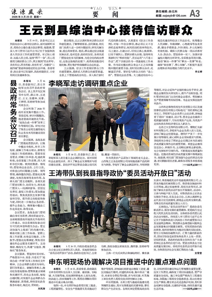 王云强调,信访工作是做好群众工作的重要载体,是联系人民群众的重要渠道。全县上下要提高政治站位。深入践行新时代党的群众路线,认真落实《信访工作条例》,对每一件信访事项,都必须以义不容辞的态度和责任、闻风而动的效率和担当,马上就办、办就办好,切实以真心换真情、以实干暖民心。要抓好源头治理。坚持和发展新时代“枫桥经验”,灵活运用“六尺巷工作法”,把下访接访作为一项基础性工作来做、作为深化整治群众身边不正之风和腐败问题的重要方面,及时回应群众诉求、化解基层矛盾,架好党与群众之间的“连心桥”。要强化法治思维。大力推进综治中心规范化建设和信访工作法治化,统筹整合人民调解、仲裁调解、心理疏导等各类资源,健全矛盾排查、纠纷调处、多元化解的有效机制,确保人民群众每一项诉求都有人办、依法办。要坚持举一反三。加强对普遍性问题的分析研究,全面排查同类问题,推动“解决一件事”向“解决一类事”转变,确保“案结事了、事心双解”,不断提升基层治理体系和治理能力现代化水平。