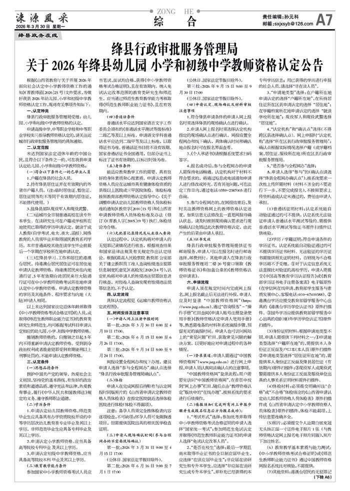 绛县行政审批服务管理局关于2026年绛县幼儿园 小学和初级中学教师资格认定公告